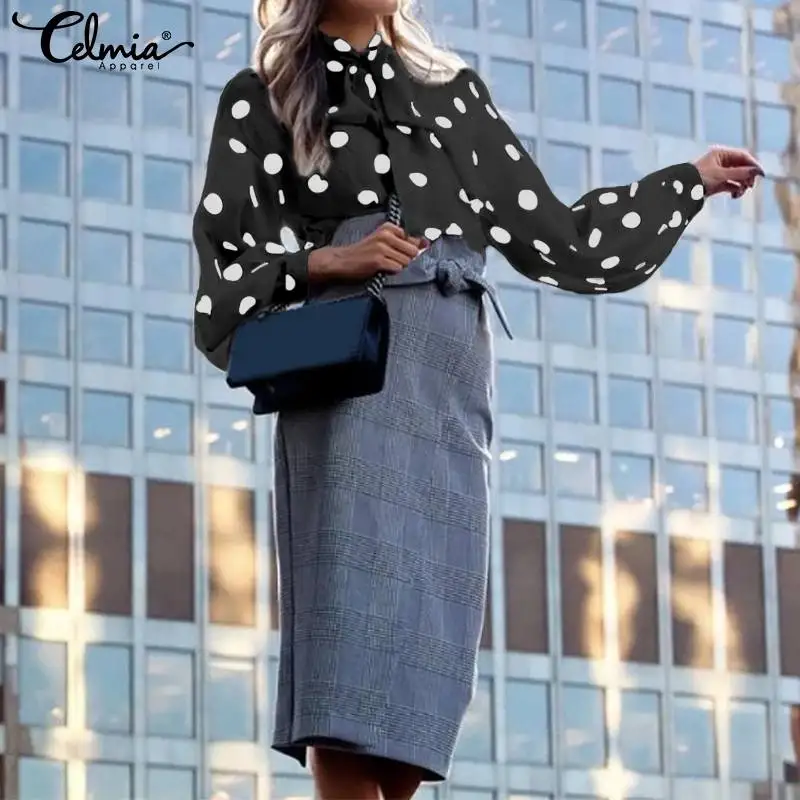 discounted Celmia Plus Size Women's Blouses Elegant White Bow Tie Neck Polka Dot Top Office Ladies Shirts Lant