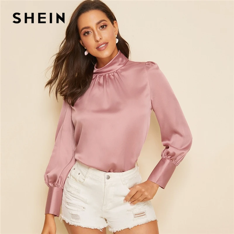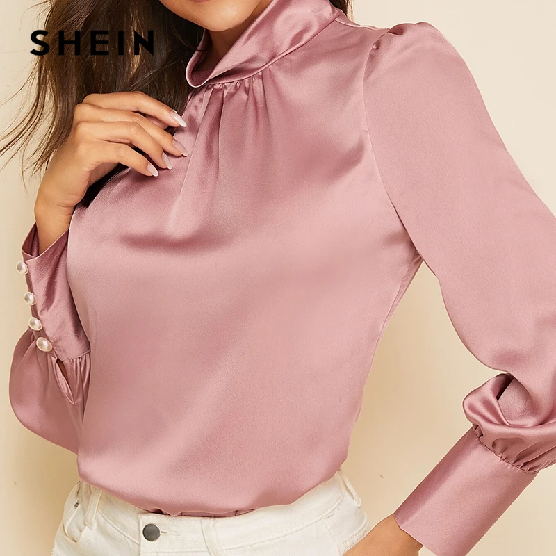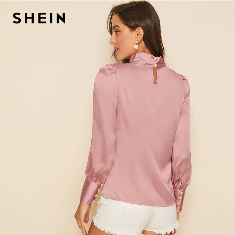 New SHEIN Pink Stand Collar Button Keyhole Satin Blouse Elegant Top Women Spring Autumn Long Sleeve Sol