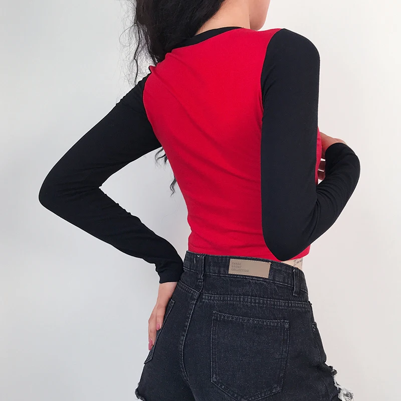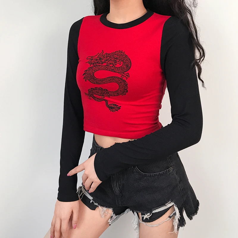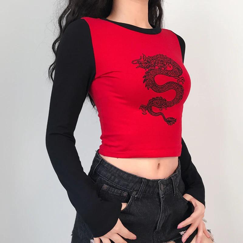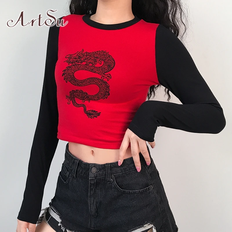 amazing ArtSu Dragon Print Basic Tshirt Women Harajuku Long Sleeve Tee Shirt Femme Patchwork Casual Crop T