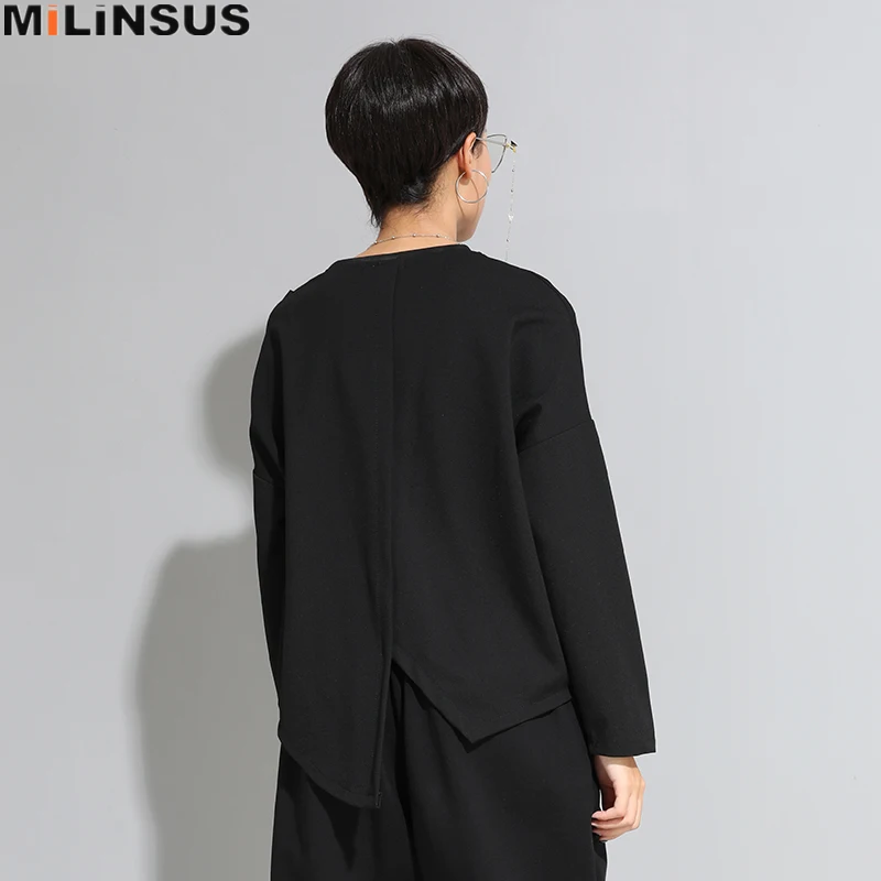price cut 2019 Autumn Occident Style Black T Shirt Women Long Sleeve Irregular Round Neck Split Joint Tops vo